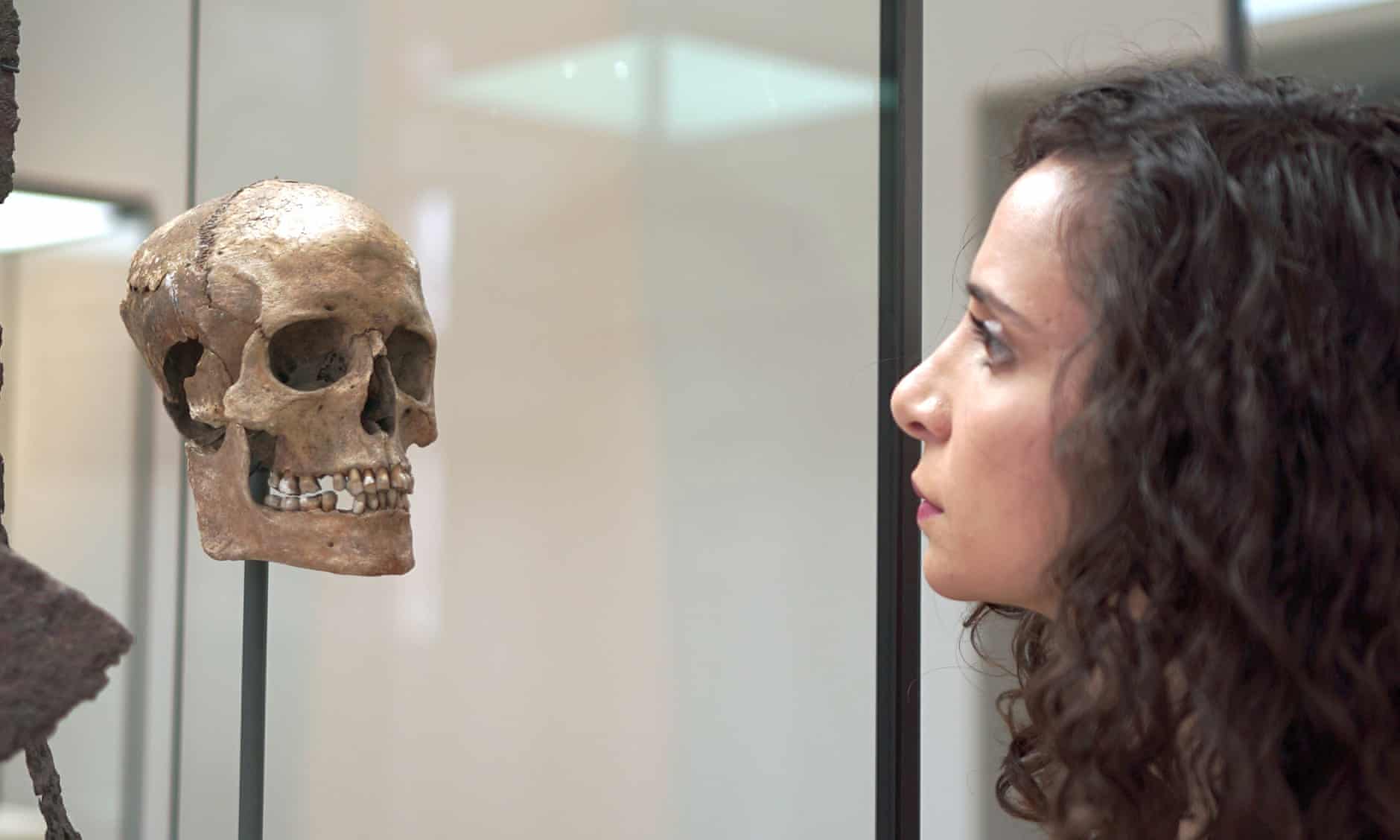 Ella Al-Shamahi comes face to face with the Viking woman’s skull. Photograph: Eloisa Noble/National Geographic